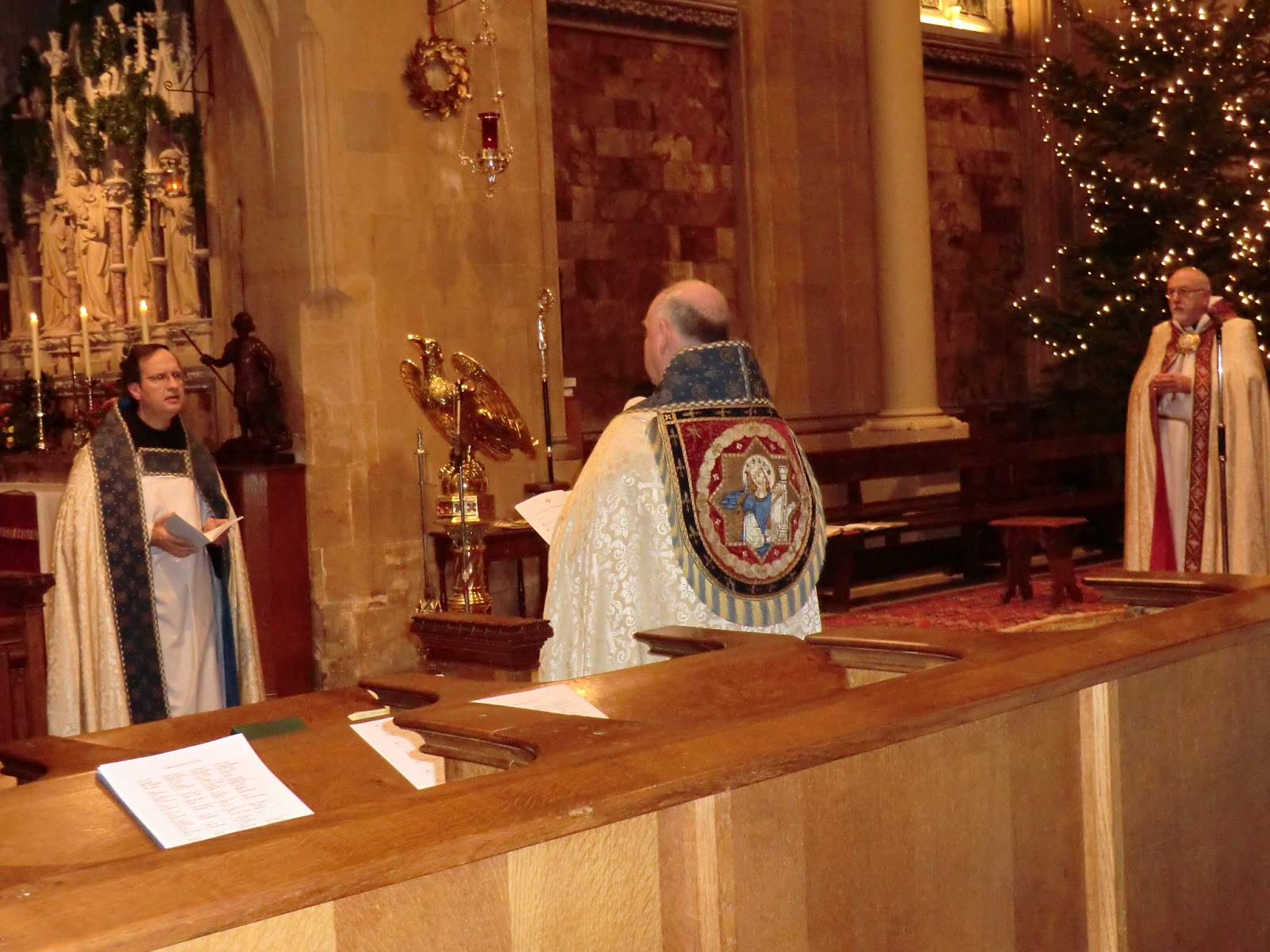The above pictures are from 2nd Vespers of Christmas, 2011. The "hoods" of the cantors' copes are very ancient and are supposed to have belonged to the royal chapel of Queen Catherine of Aragon, but we have no proof of this..
